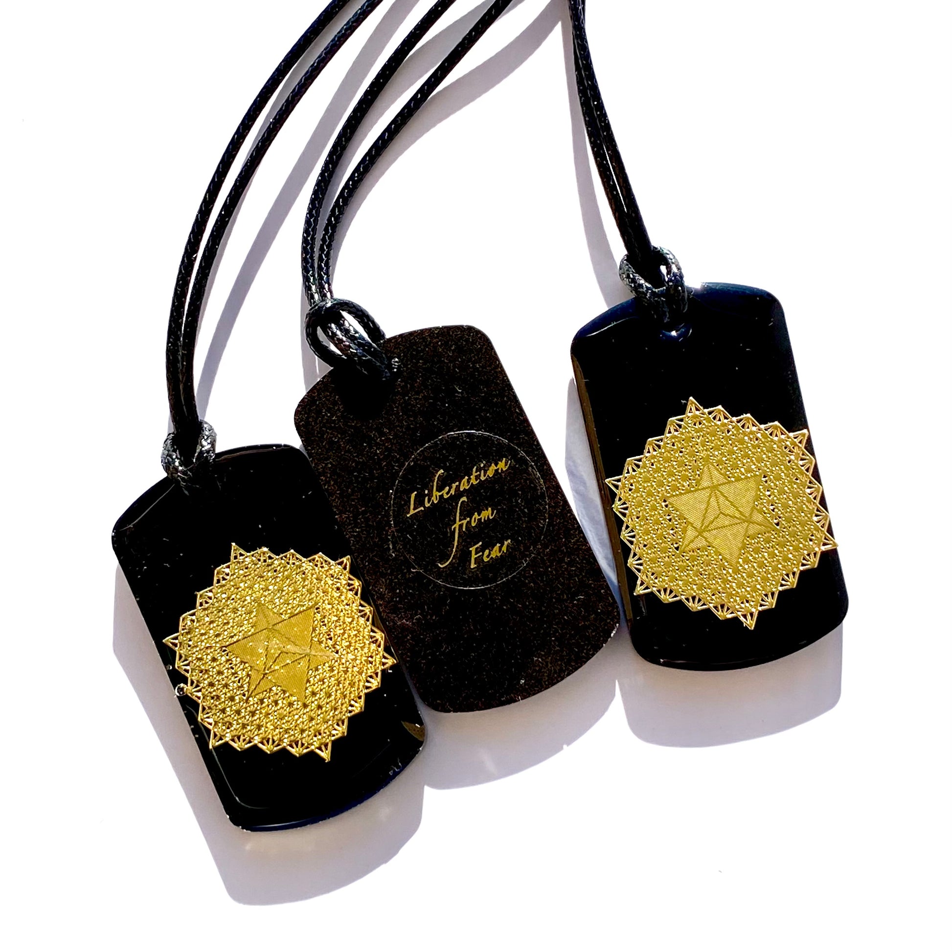 These Dog tag style pendants are compressed with frequency that clears past residual fear* (that presents and impacts in the present) allowing the ability to navigate current climate and crisis objectively.